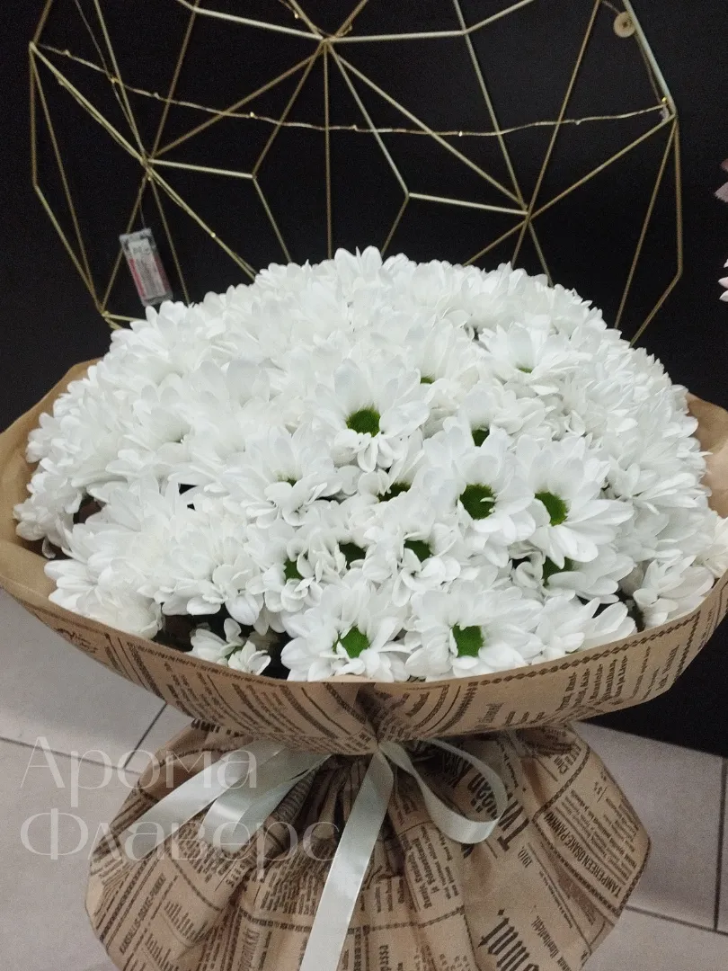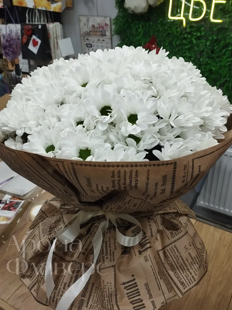 Букет из белых хризантем, завернутый в бумагу с газетным принтом и перевязанный атласной лентой, представляет собой элегантное и сдержанное решение для любого торжества. Хризантемы символизируют верность, оптимизм и долголетие, что делает их прекрасным выбором для выражения глубоких чувств. Букет излучает спокойствие и изящество, наполняя пространство уютом и свежестью.