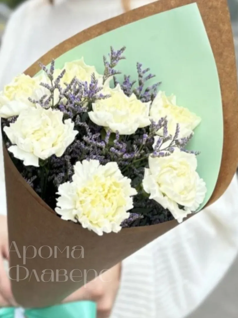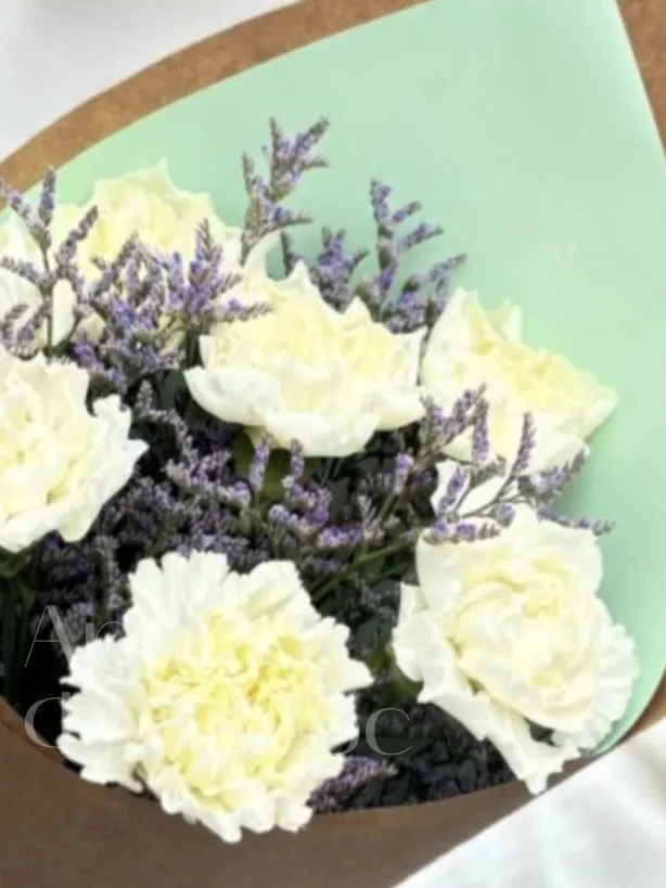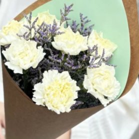 Букет, состоящий из гвоздик, дополненный изящными веточками лимонимума, идеально подойдёт для подарка близкому человеку или коллеге в честь особого случая. Нежные оттенки цветов создают атмосферу лёгкости и элегантности, делая букет выразительным и утончённым.