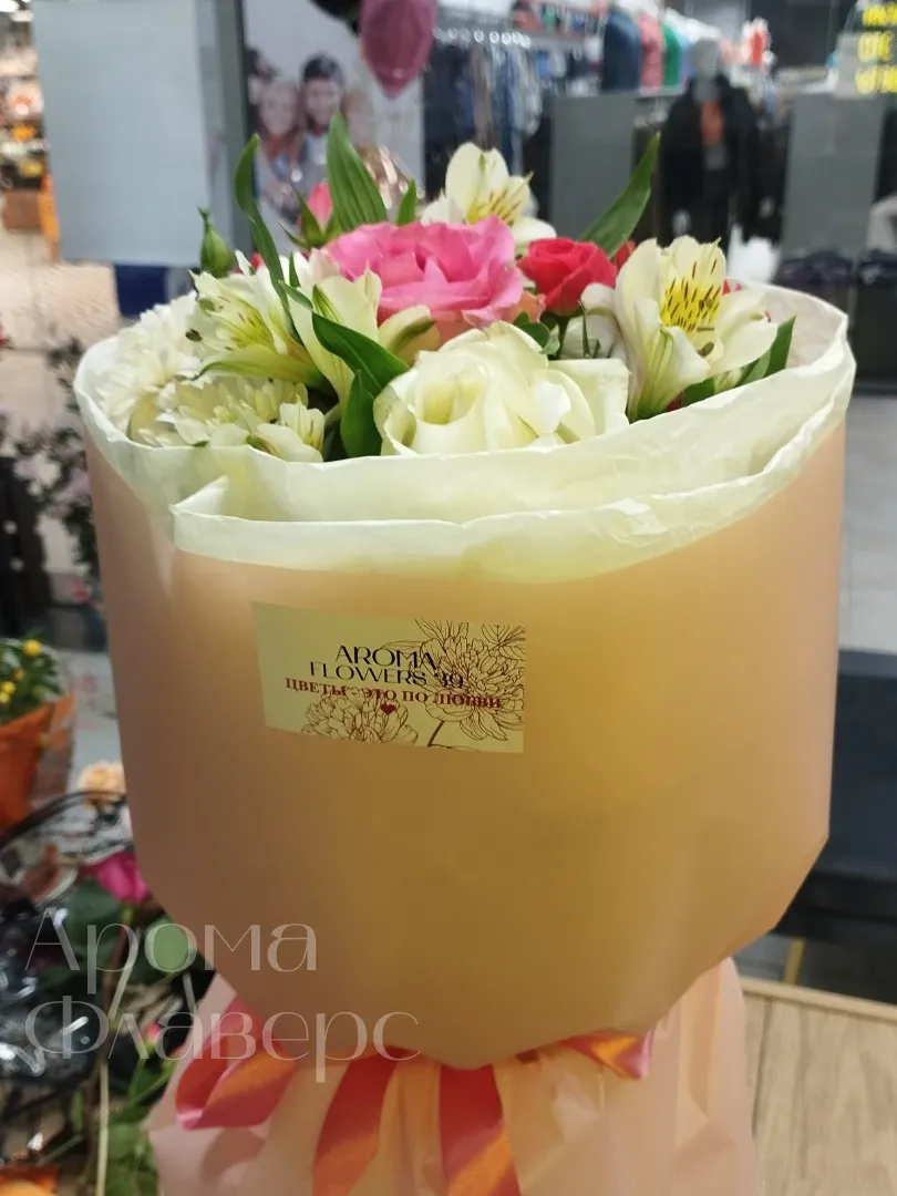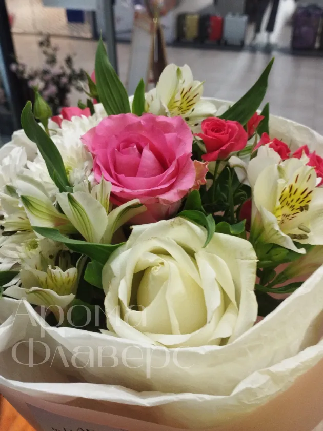 Нежная и элегантная композиция из белых роз, розовых роз, хризантемы и белых альстромерий. Белые розы придают букету воздушность и чистоту, а розовые розы добавляют изящества и романтичности. Альстромерии дополняют композицию своей легкостью и изысканностью. Букет идеально подходит для выражения нежных чувств и станет прекрасным подарком для близкого человека.