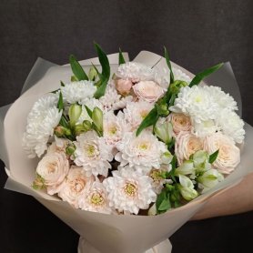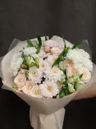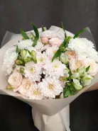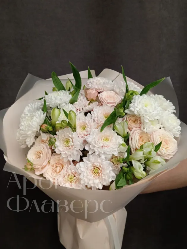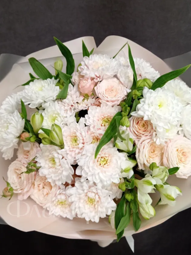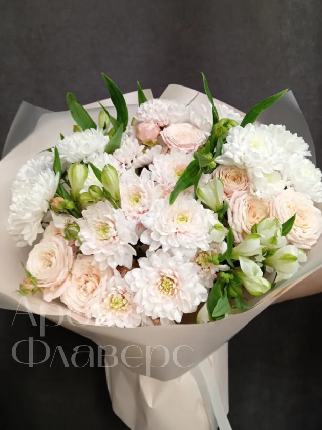 Букет их хризантем, альстромерии и кустовых роз «Нежное очарование»