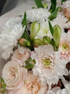 Букет является воплощением нежности и элегантности. Составленный из светло-персиковых хризантем, с добавлением альстромерии и кустовых роз. Он создает ощущение воздушности и легкости. Букет красиво оформлен в нежно розовую упаковку с лентой, что добавляет ему изысканности и делает подходящим для различных торжественных случаев.