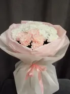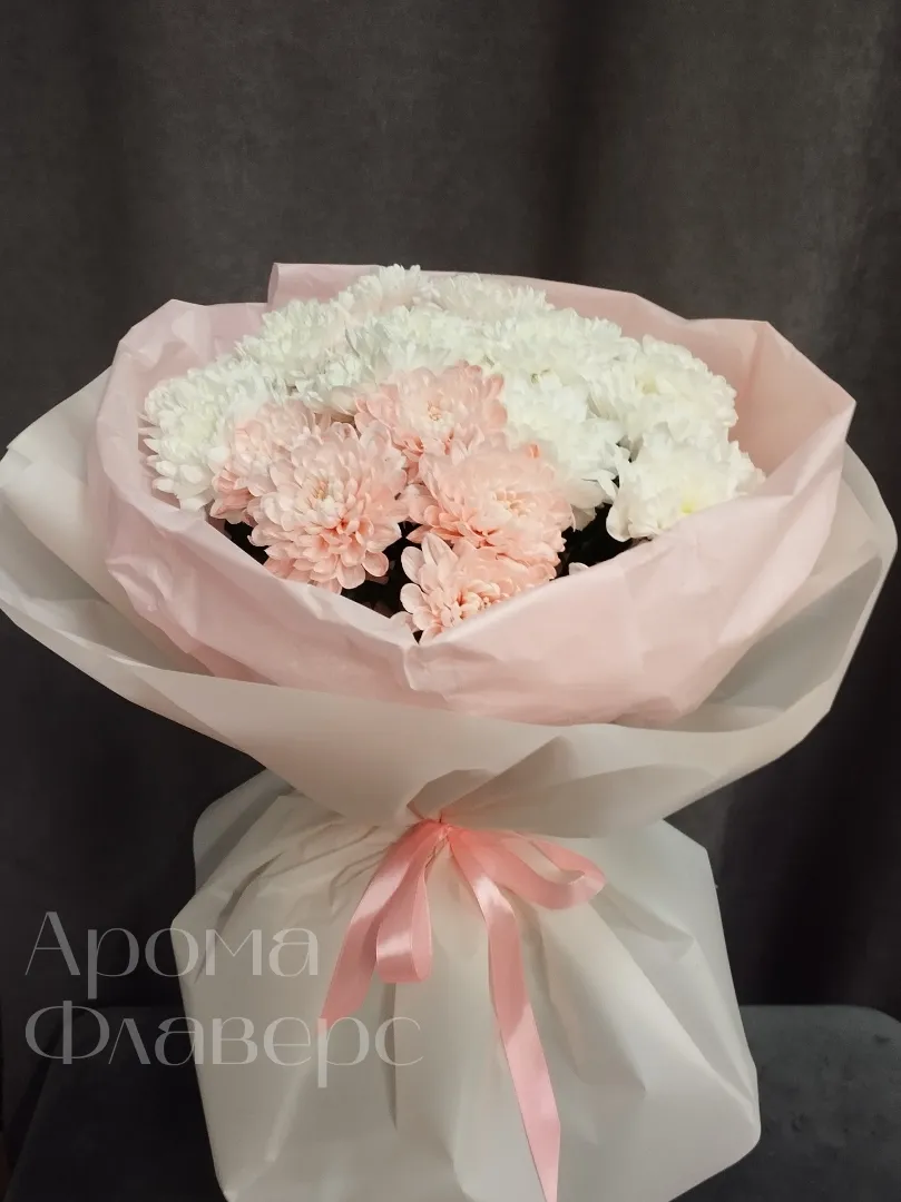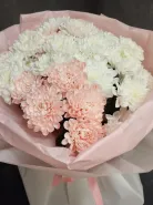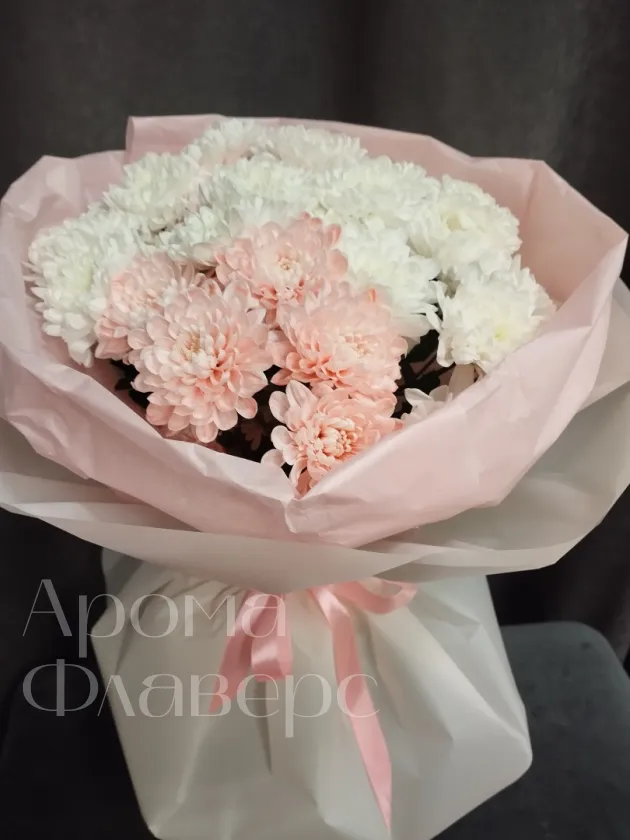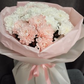 Букет нежного оттенка, состоящий из белых и персиковых хризаньем, идеально подойдёт для выражения светлых чувств и эмоций. Мягкая цветовая гамма и воздушные бутоны создают атмосферу уюта и теплоты, делая букет приятным подарком для близких и друзей. Изящная упаковка с атласной лентой добавляет композиции завершённый и элегантный вид.