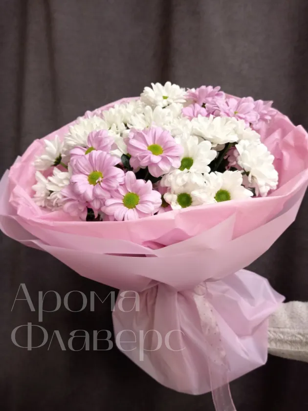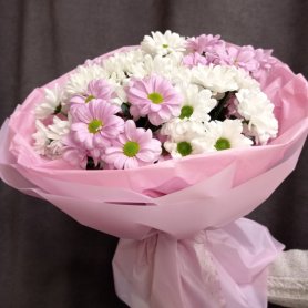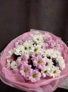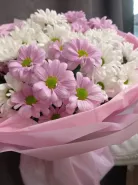 Букет из хризантем нежных оттенков - воздушное сочетание белых и розовых цветов, создающее впечатление легкости и природной гармонии. Нежная упаковка букета лишь подчеркивает его природную красоту. Этот букет станет прекрасным выражением заботы и внимания для близких и друзей.