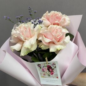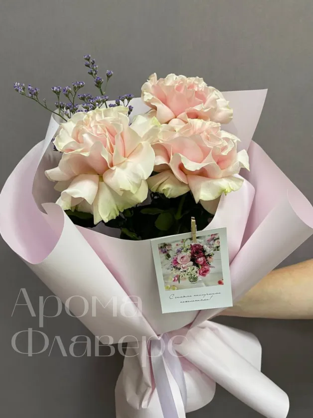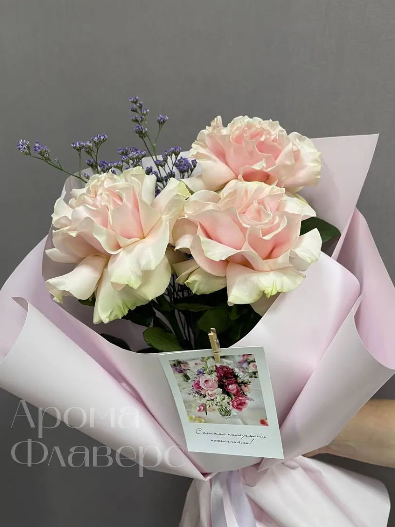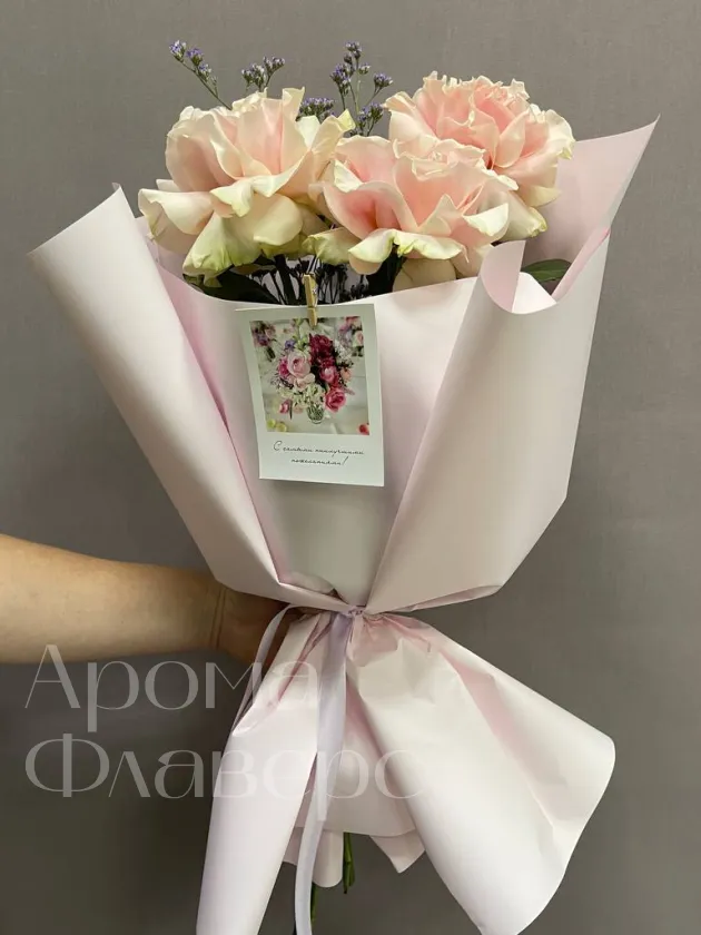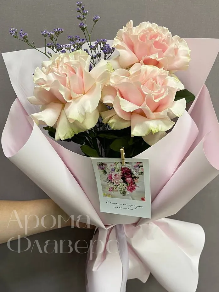 Букет из крупных нежно-розовых роз, дополненный лимонимумом, станет прекрасным выражением чувств. Нежная цветовая гамма и элегантная упаковка создают образ изысканного и трогательного подарка.