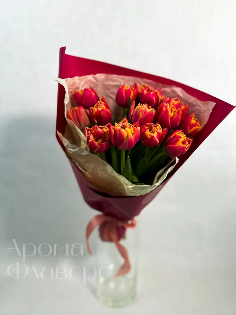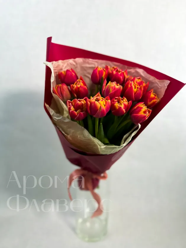 Букет из красно-желтых пионовидных тюльпанов