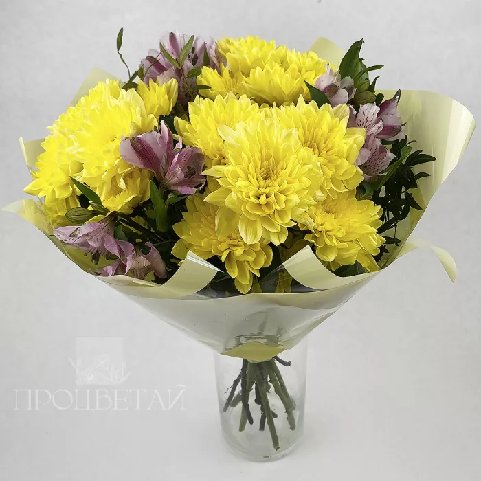 Букет с хризантемами и альстромериями, эти цветы гармонично сочетаются вместе