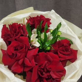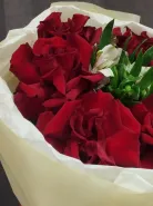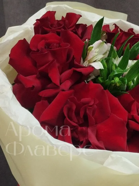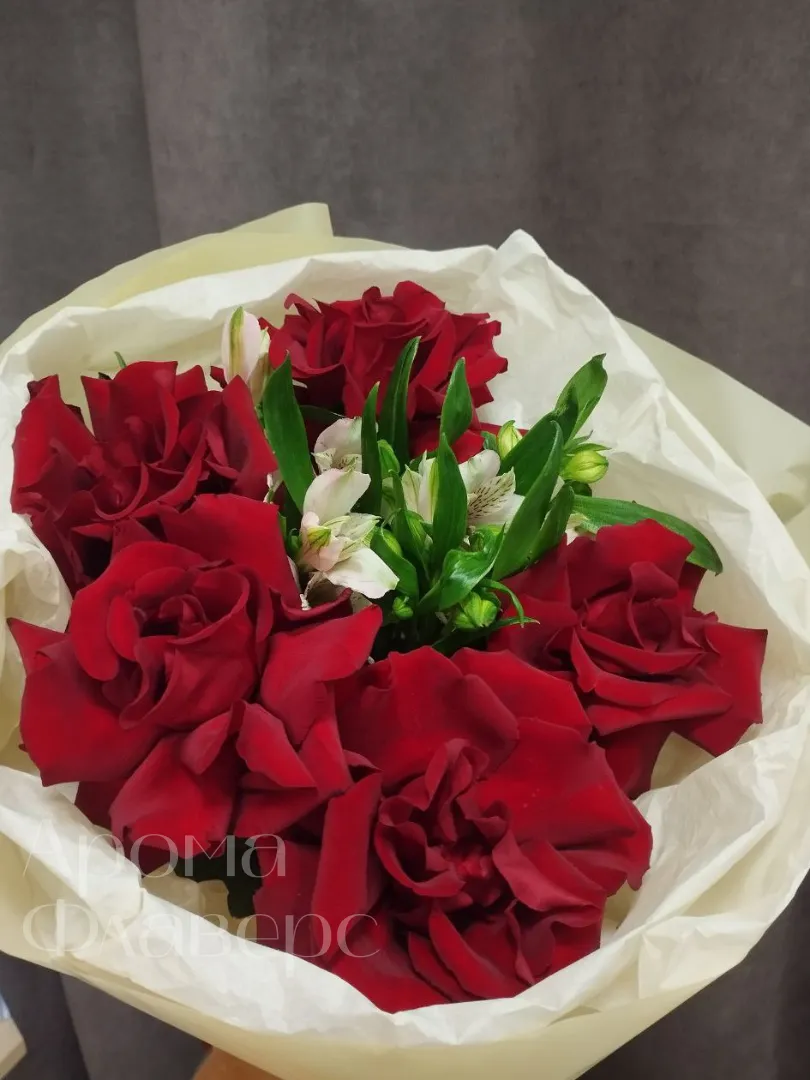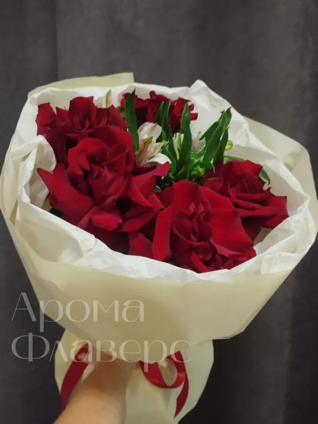 Элегантный букет из крупных темно-красных роз с нежными бело-розовыми альстромериями в центре. Этот классический подарок излучает страсть и изящество. Розы символизируют глубокую любовь, а альстромерия добавляет букету свежесть и нежность.