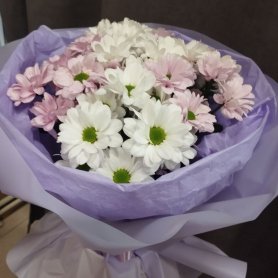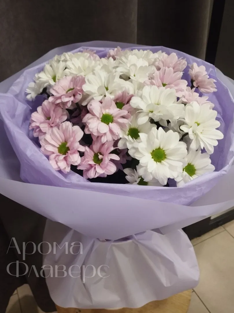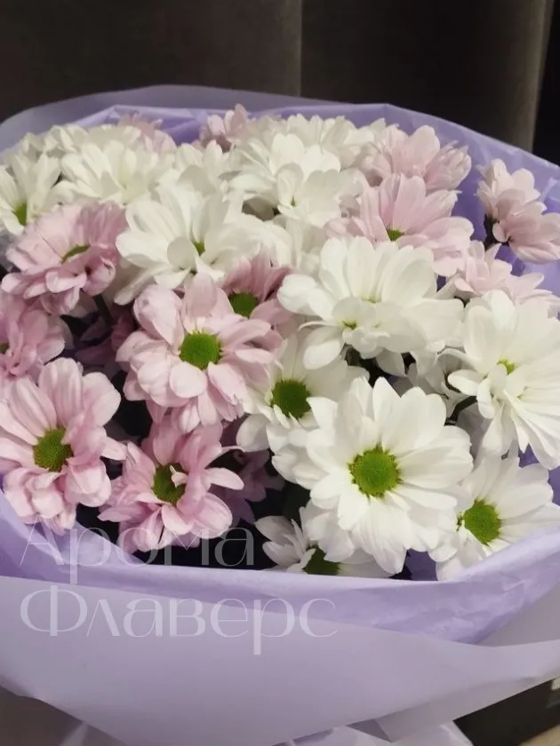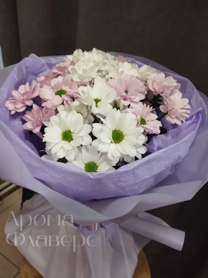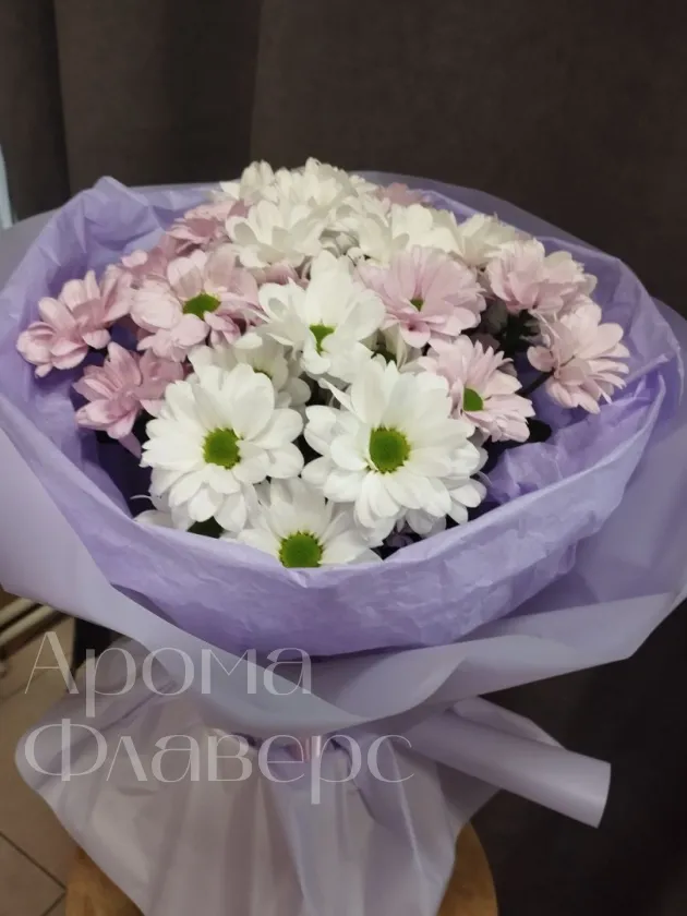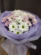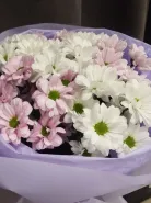 Букет нежного оттенка из белых и светло-розовых хризантем, элегантно упакованный в лавандовую бумагу, станет прекрасным подарком для самых дорогих людей. Хризантемы символизируют долголетие и радость, а их сдержанная красота подчеркнет вашу искреннюю заботу. Этот букет создаст атмосферу уюта и тепла, наполняя пространство нежностью и свежестью цветов.