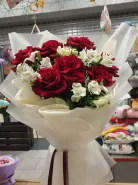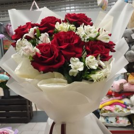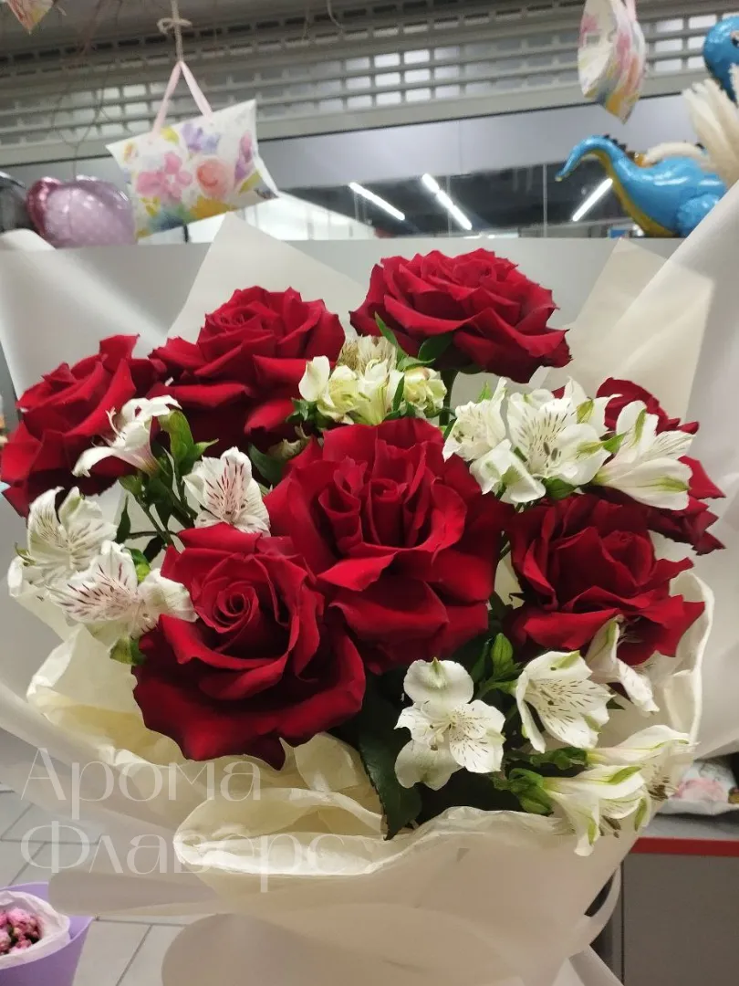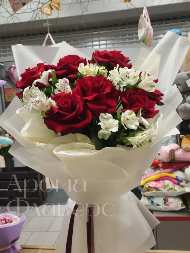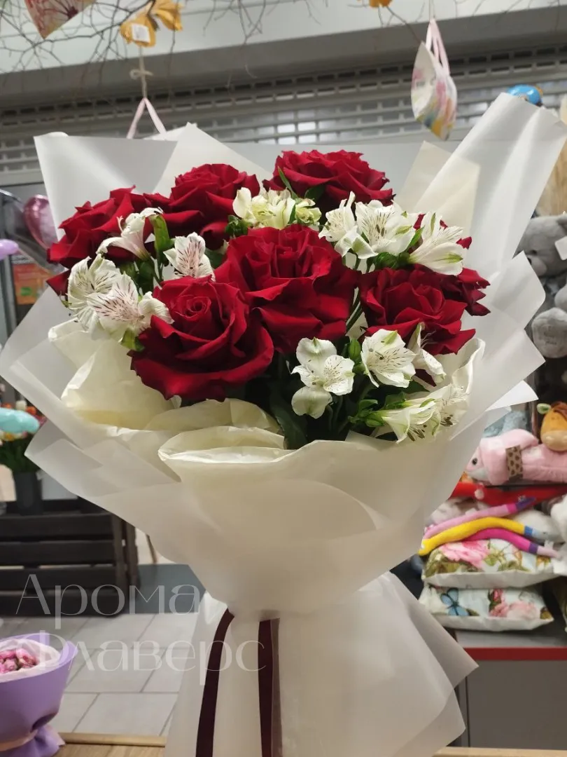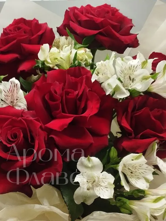 Букет, представленный на изображении, - это элегантная композиция, состоящая из крупных красных роз и бело-розовых альстромерий. Розы являются центральными элементами букета, их насыщенный красный цвет привлекает внимание и символизирует страсть и любовь. Альстромерии, с их тонкими белыми лепестками, добавляют букету нежности и изящества. Букет красиво упакован в белую бумагу, что подчеркивает свежесть и элегантность цветов.
