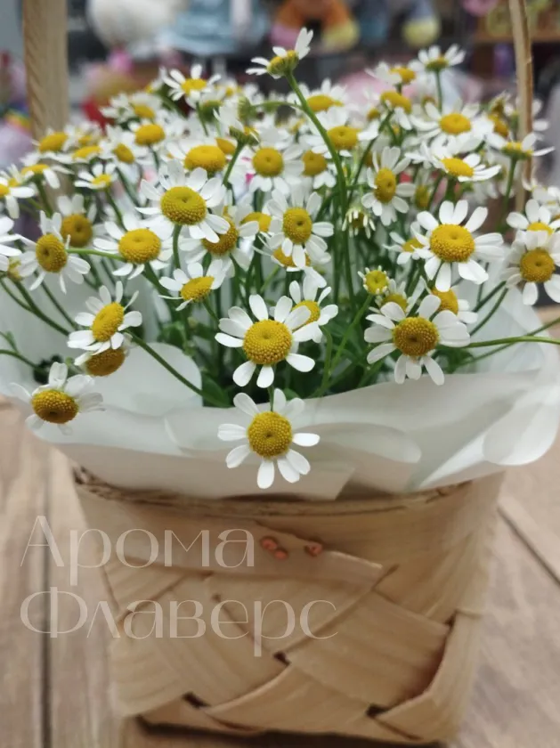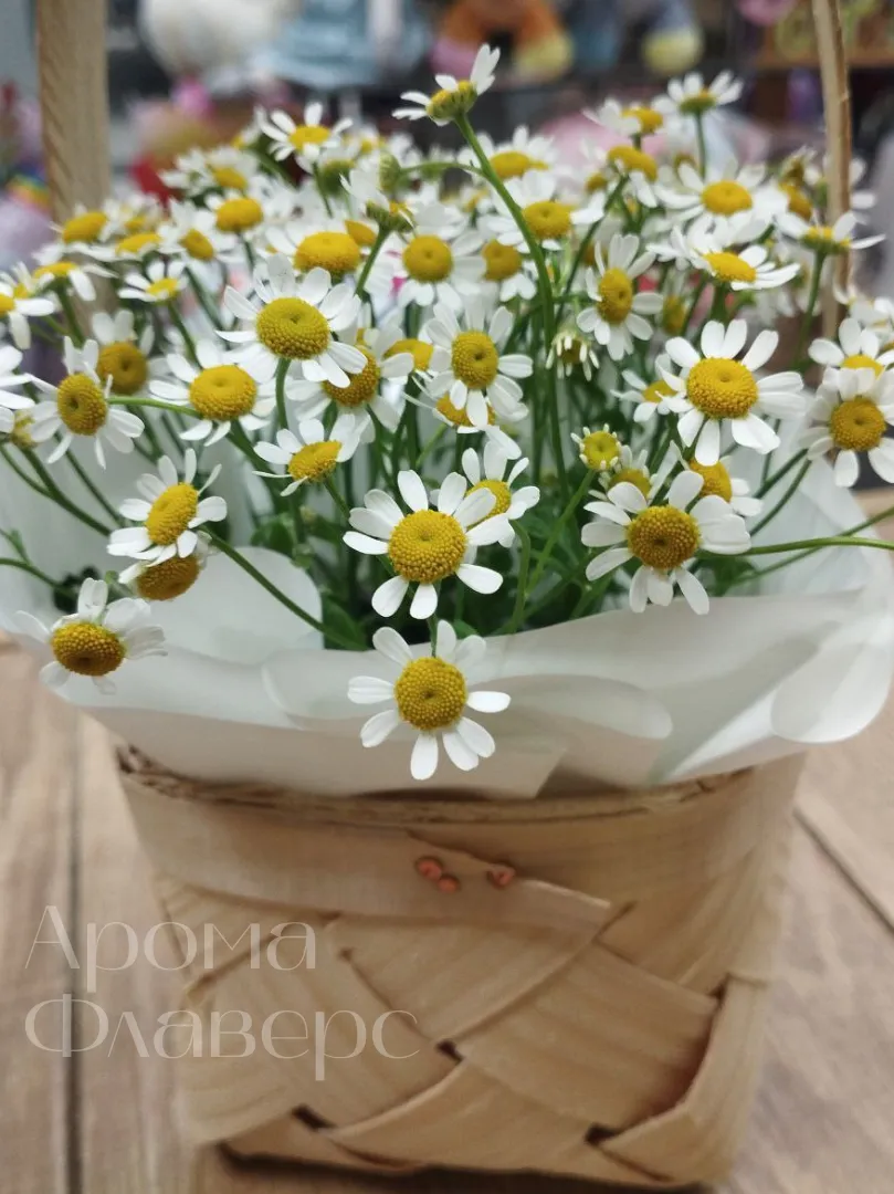 Ромашки в корзинке. Нежные ромашки в плетеной корзине излучают тепло и свежесть полевых цветов. Аромат лета и беззаботности в каждой веточке. Яркий букет создаст летнее настроение в любой комнате.