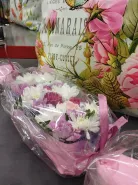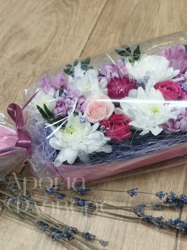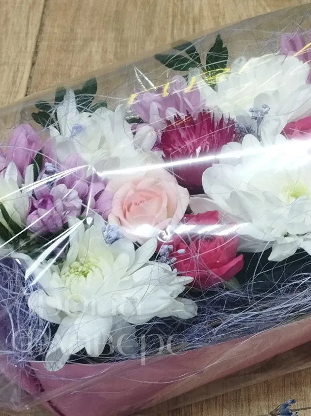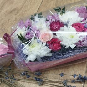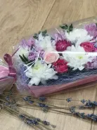 Композиция состоящая из белых и розовых хризантем и роз, дополненный изящной листвой и деликатными веточками пистации, тщательно упакован в прозрачную пленку с атласной лентой и являет собой нежный подарок. Хризантемы и розы создают объемную композицию с ненавязчивым сладким ароматом.