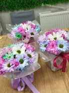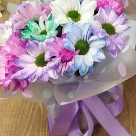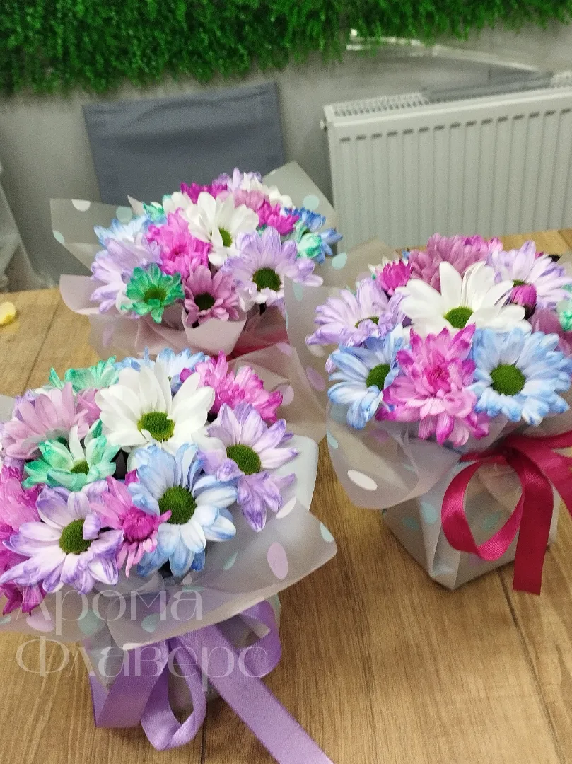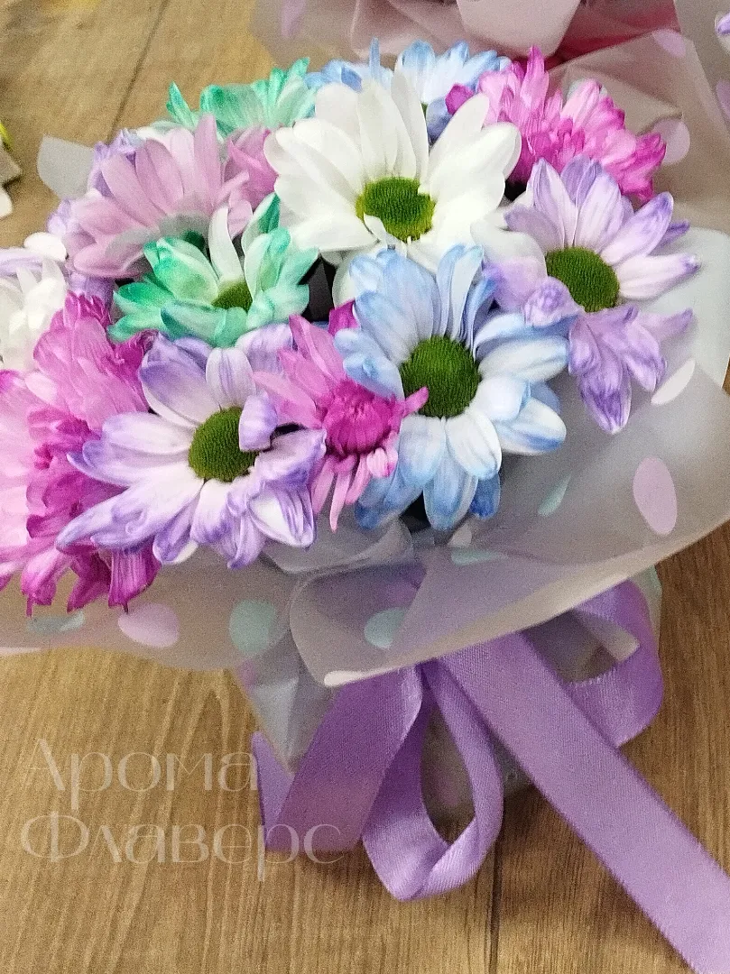Букет из разноцветных хризантем, окрашенных в яркие оттенки синего, фиолетового, розового и белого цветов, создаст яркий акцент в любом интерьере. Хризантемы символизируют искренность и долголетие, а их разнообразная палитра позволяет подобрать букет под любой вкус. Такой букет станет прекрасным подарком для близких или выразит ваши чувства в особых моментах.