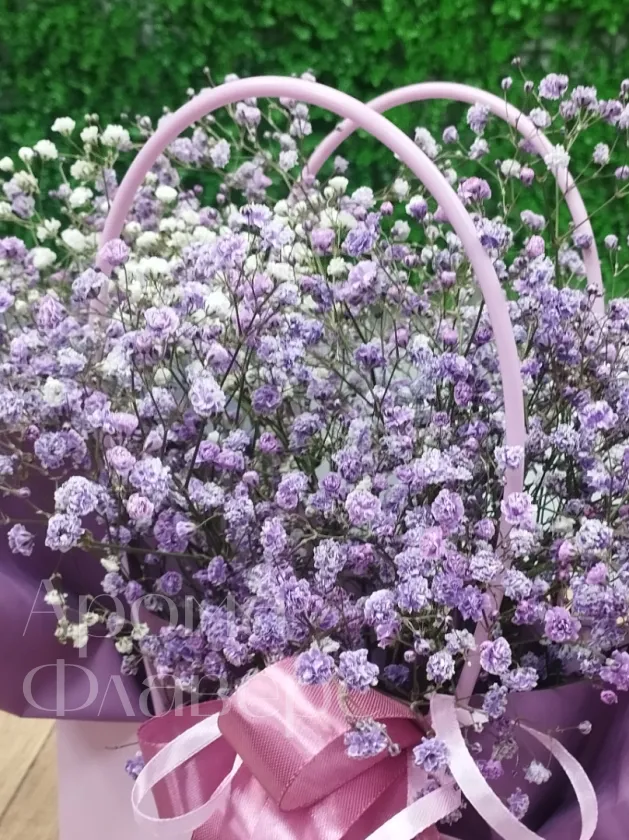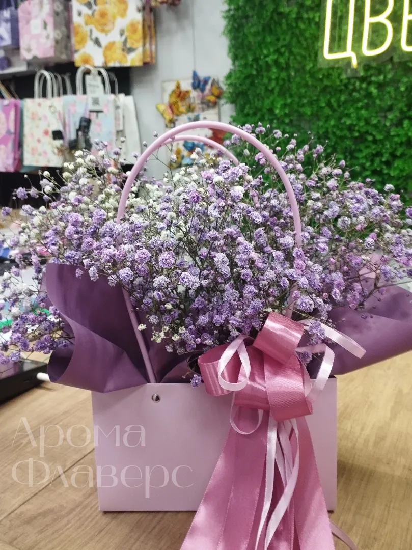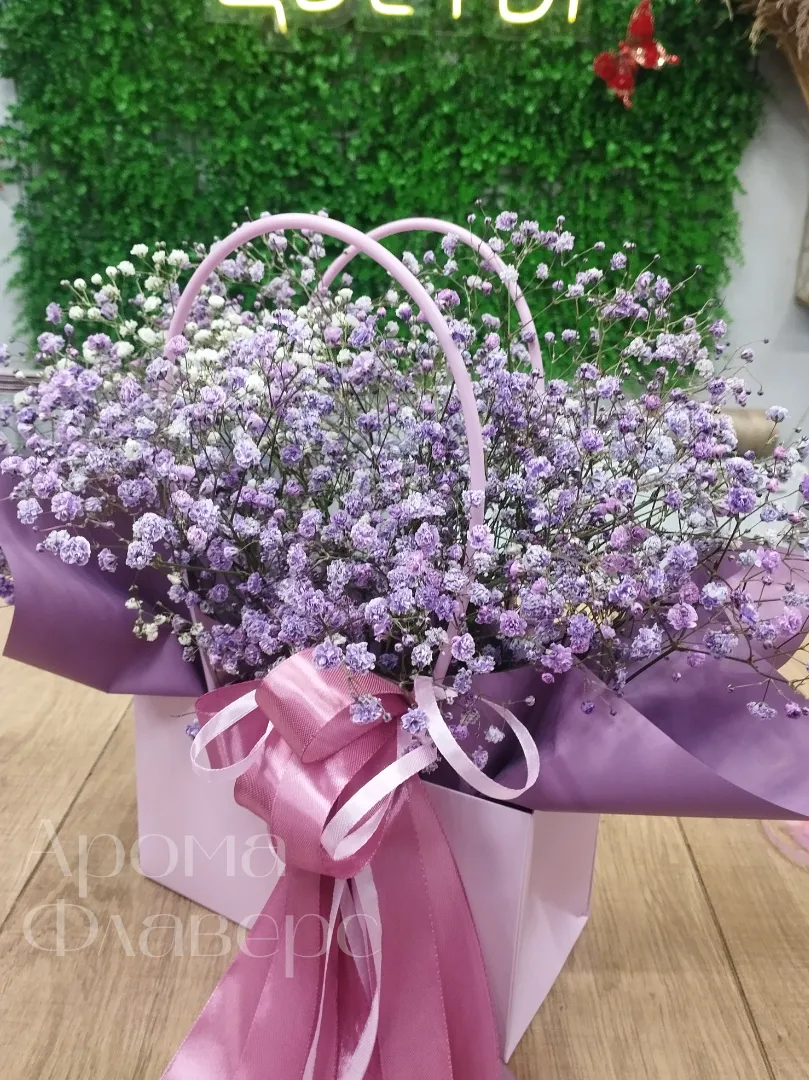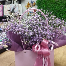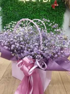 Букет из гипсофил в нежных оттенках упакован в элегантную коробку с атласной лентой. Воздушные соцветия создают лёгкую, романтичную композицию, идеальную для подарка или особенного случая. Нежная цветовая гамма и изящная подача делают букет особенно трогательным.