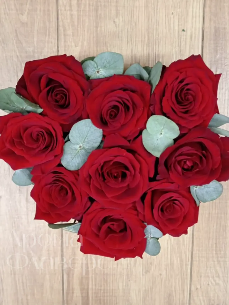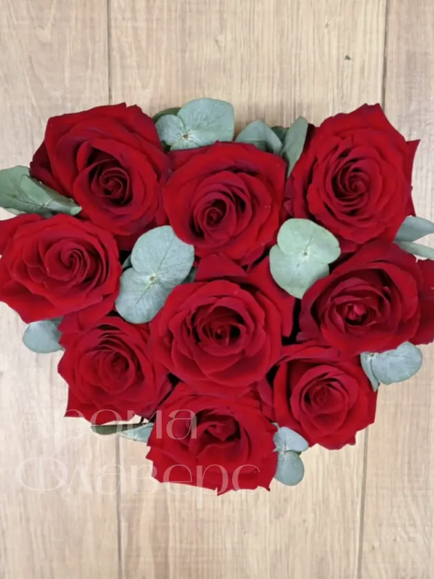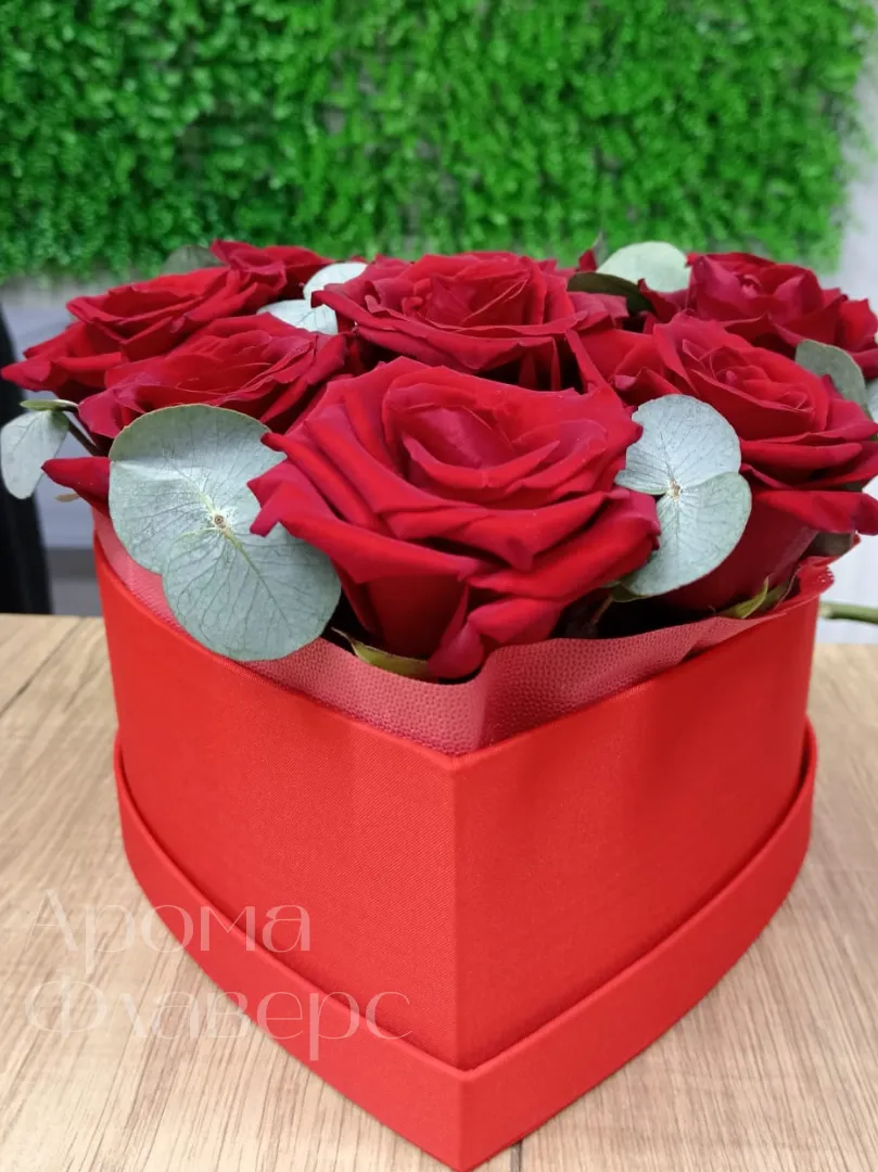 Комозиция из роскошных красных роз, элегантно дополненный изумрудной эвкалиптовой зеленью, представлен в оригинальной подарочной коробке в форме сердца. Эта страстная и трогательная композиция станет идеальным подарком для самых дорогих людей