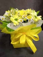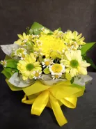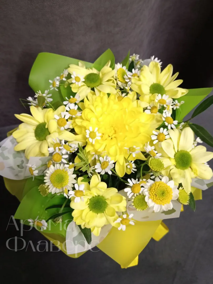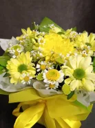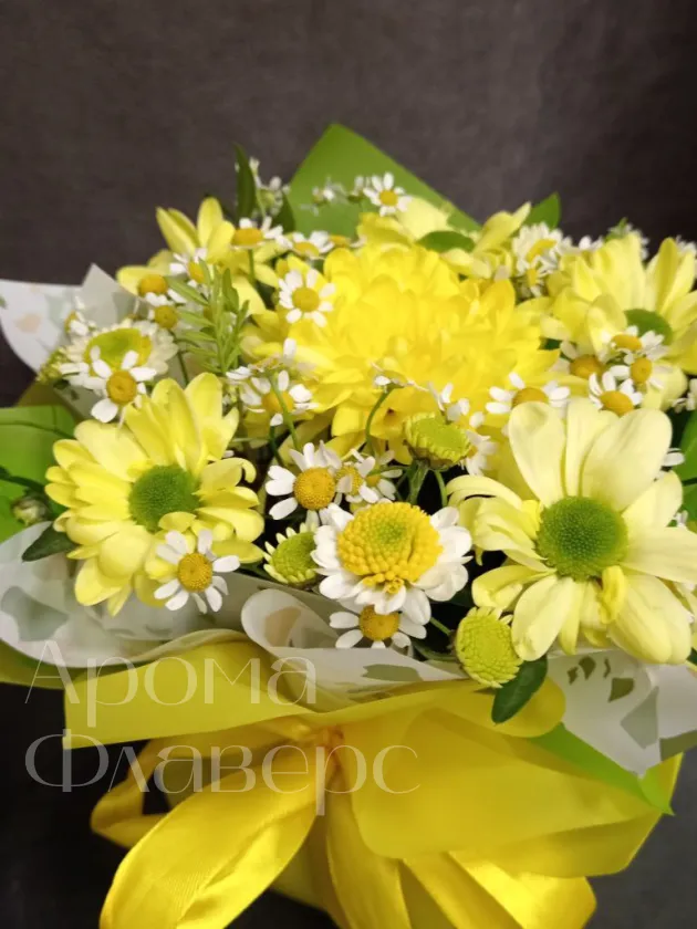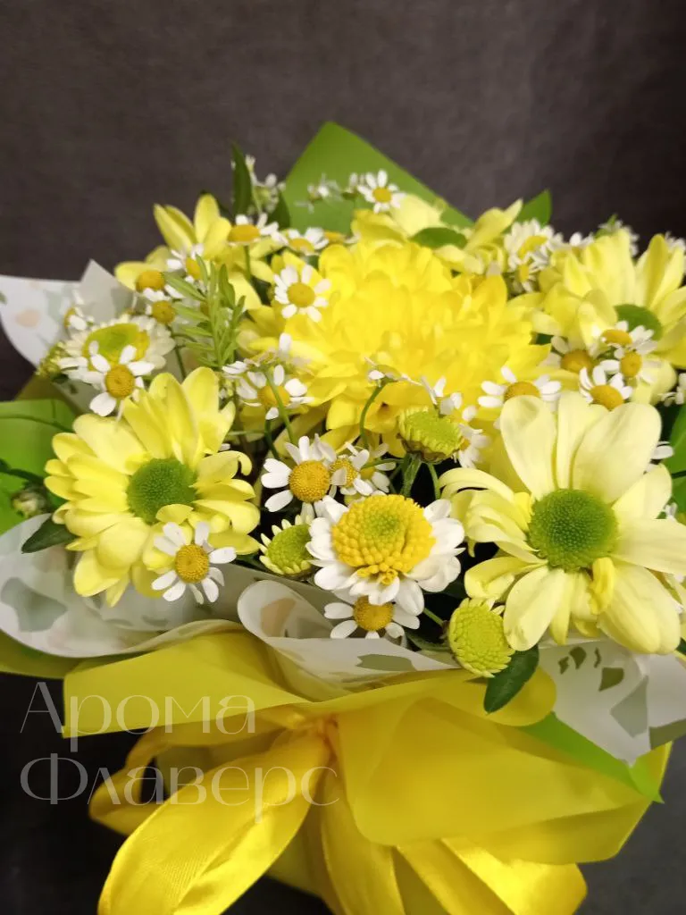 Композиция, наполненная солнечным светом, состоит из желтых хризантем, ромашек и других цветов, создавая яркое и жизнерадостное настроение. Это идеальный подарок для тех, кто хочет подарить тепло и улыбку. Красивая желтая лента добавляет букету особый шарм и завершенность.