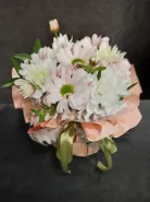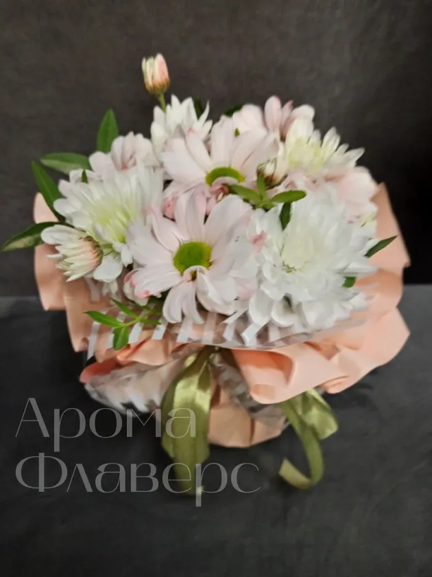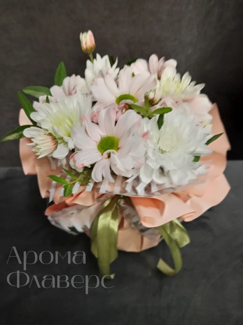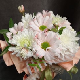 Нежная композиция , созданная из белых и светло-персиковых Хризантем, станет прекрасным подарком для самых дорогих и близких людей. Пышная зелень и воздушная упаковка добавляют композиции особую элегантность.