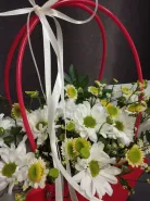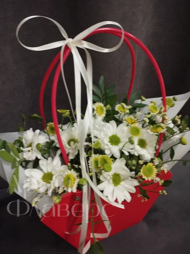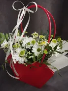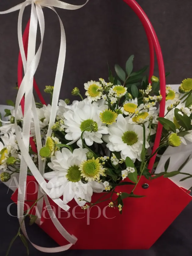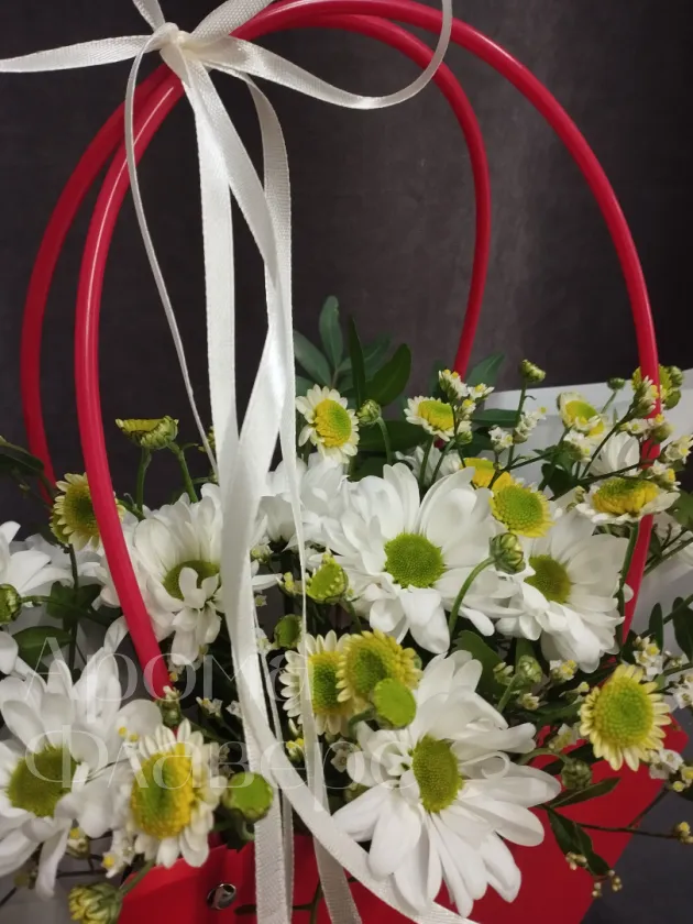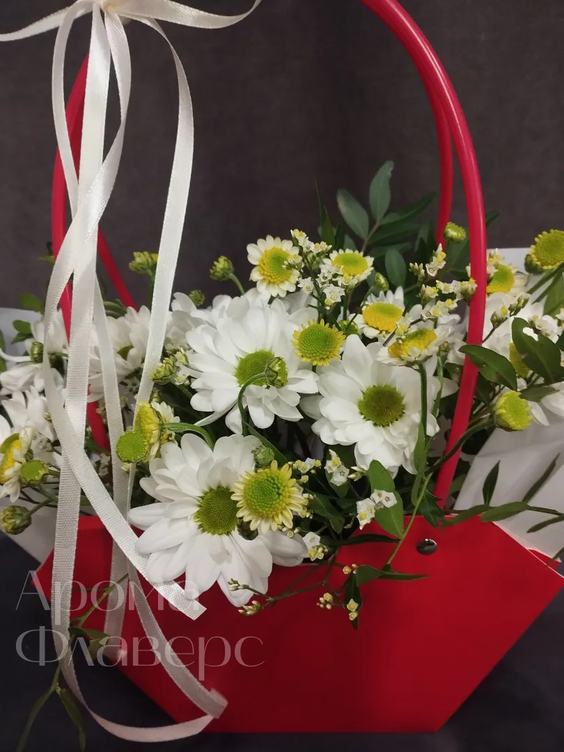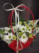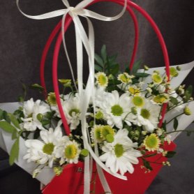 Композиция из белых хризантем и ромашек, дополненный зеленью, представлен в яркой красной сумочке с изящной белой лентой. Этот оригинальный подарок станет прекрасным выражением внимания и заботы. Букет в красной сумочке обязательно порадует получателя своей свежестью и нежностью.