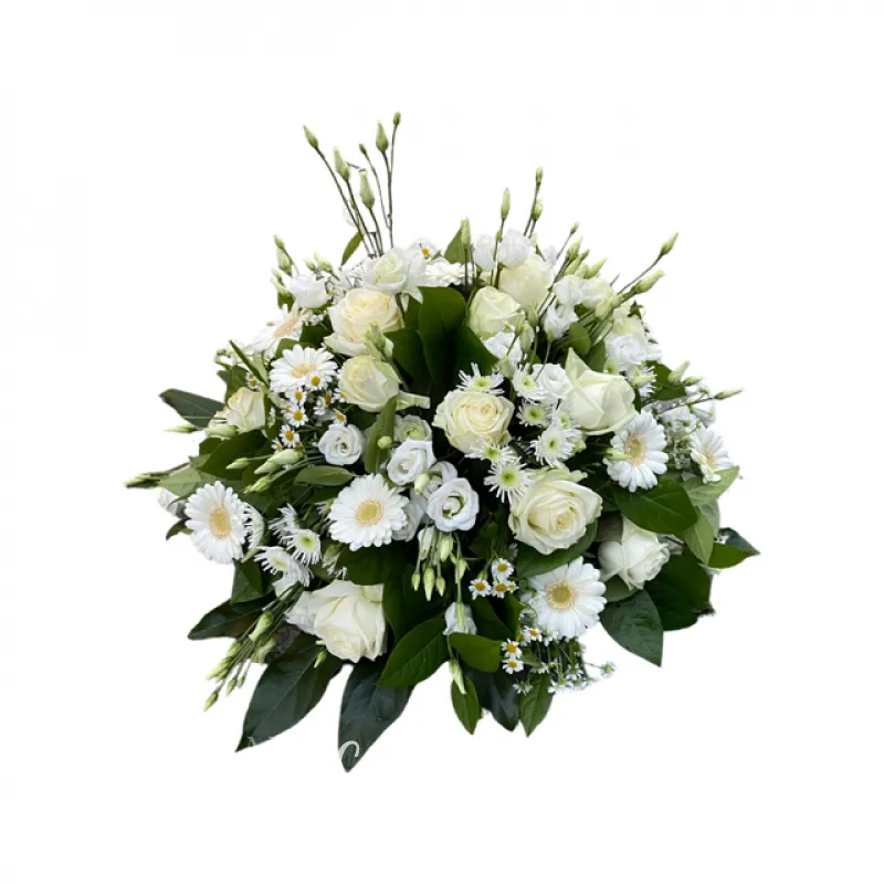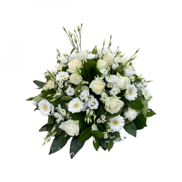 Траурный шар из белых цветов. Выражает соболезнования и искренние теплые чувства.