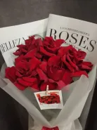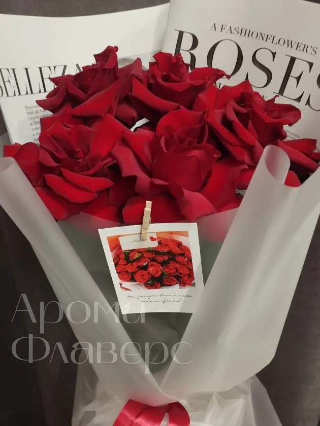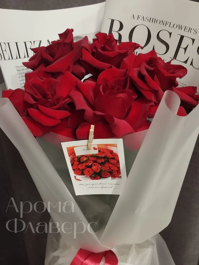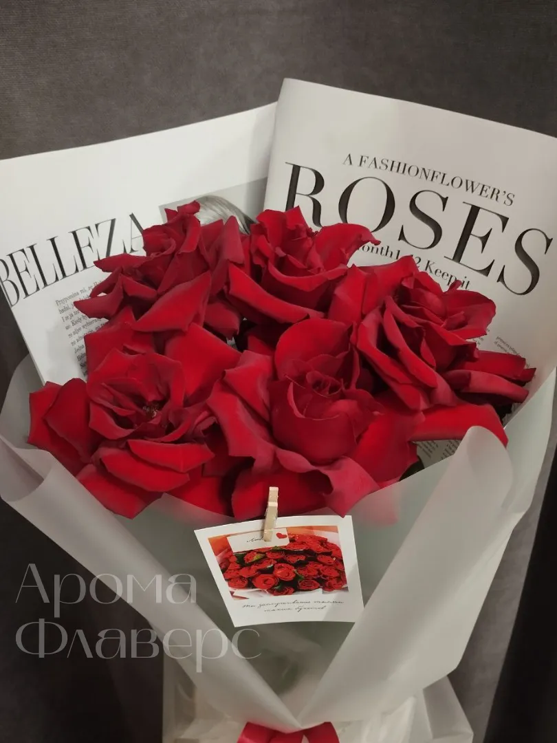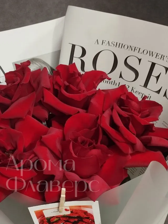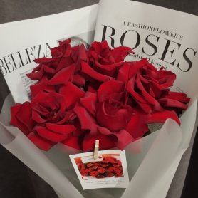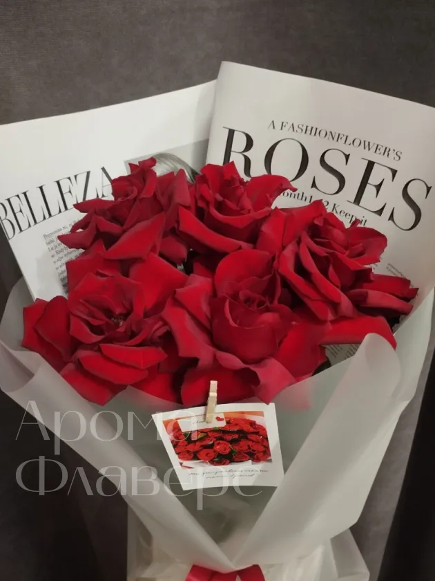 Букет из красных роз, элегантно упакованный в белую бумагу и перехваченный яркой лентой. Журналы, сопровождающие композицию, усиливают стильную подачу подарка. Этот букет станет ярким и запоминающимся выражением чувств и внимания.