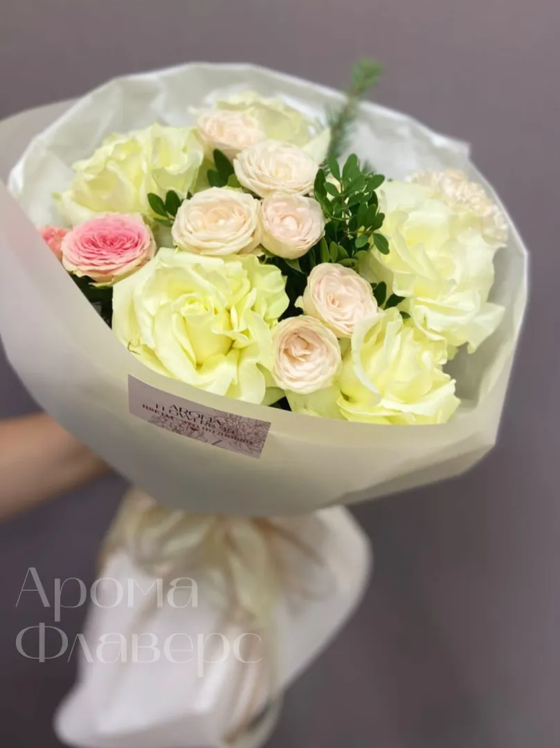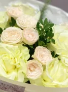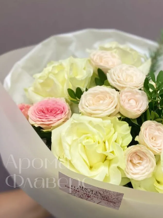 Нежный букет, состоящий из белых рос с добавление кустовой розы персикового и розового цвета, станет прекрасным подарком для близкого человека. Букет элегантен, его пастельные тона наполнены свежестью и легкостью.